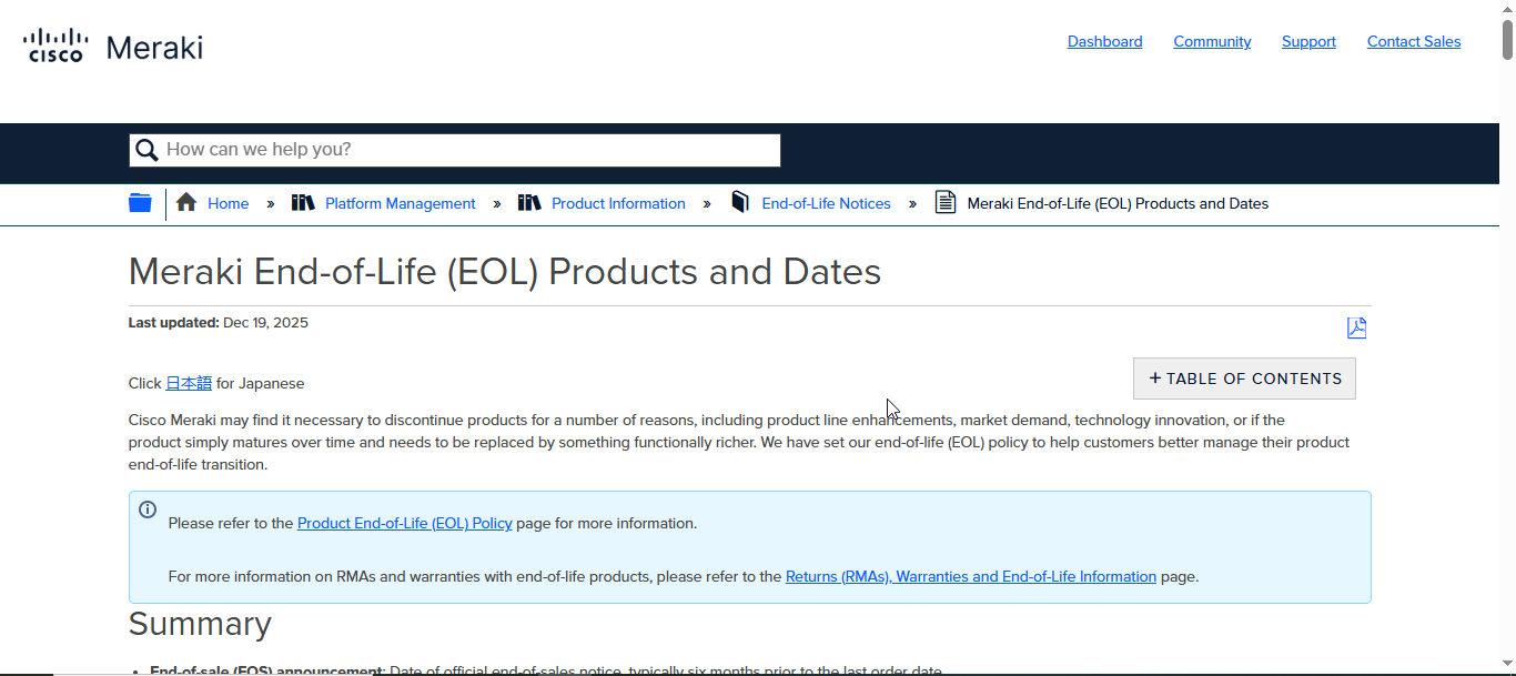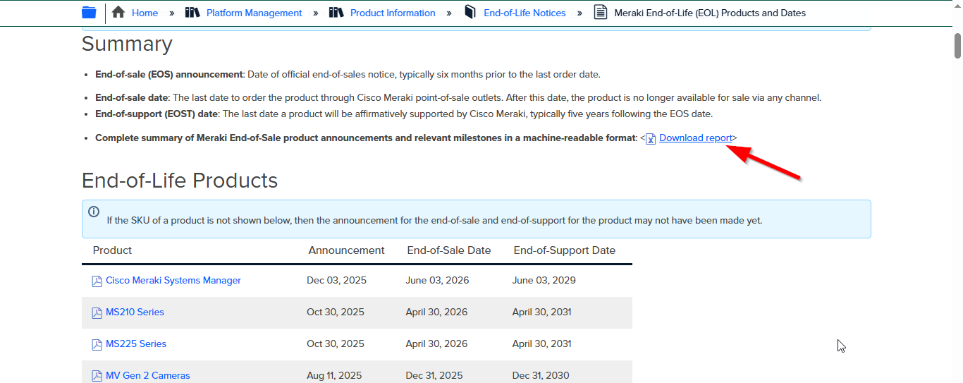Meraki provides End-of-Life (EoX) dates in a standardized format and consolidated into a single downloadable PDF document.