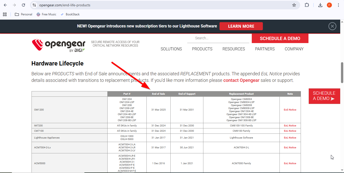 OpenGear does not provide End-of-Life (EoX) dates in a downloadable document. Instead, the information is available as a summary on their website and must be manually extracted.